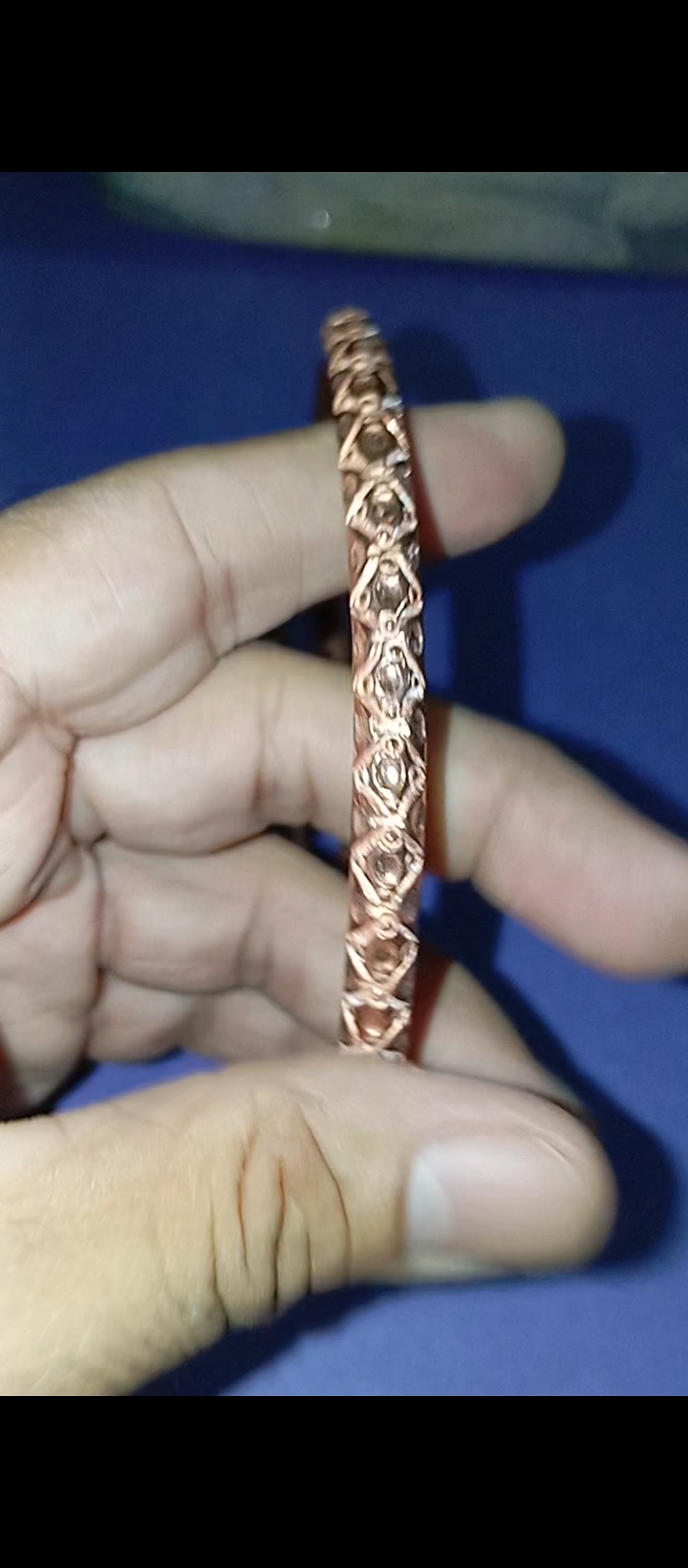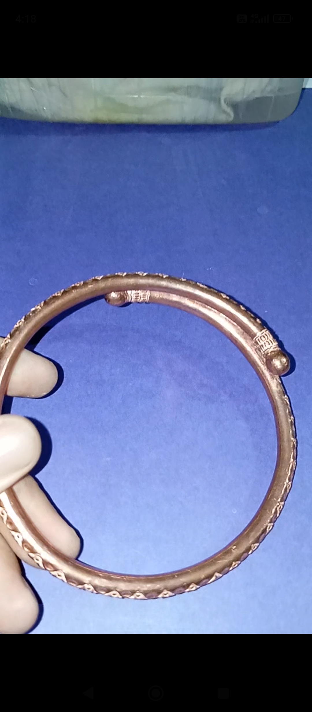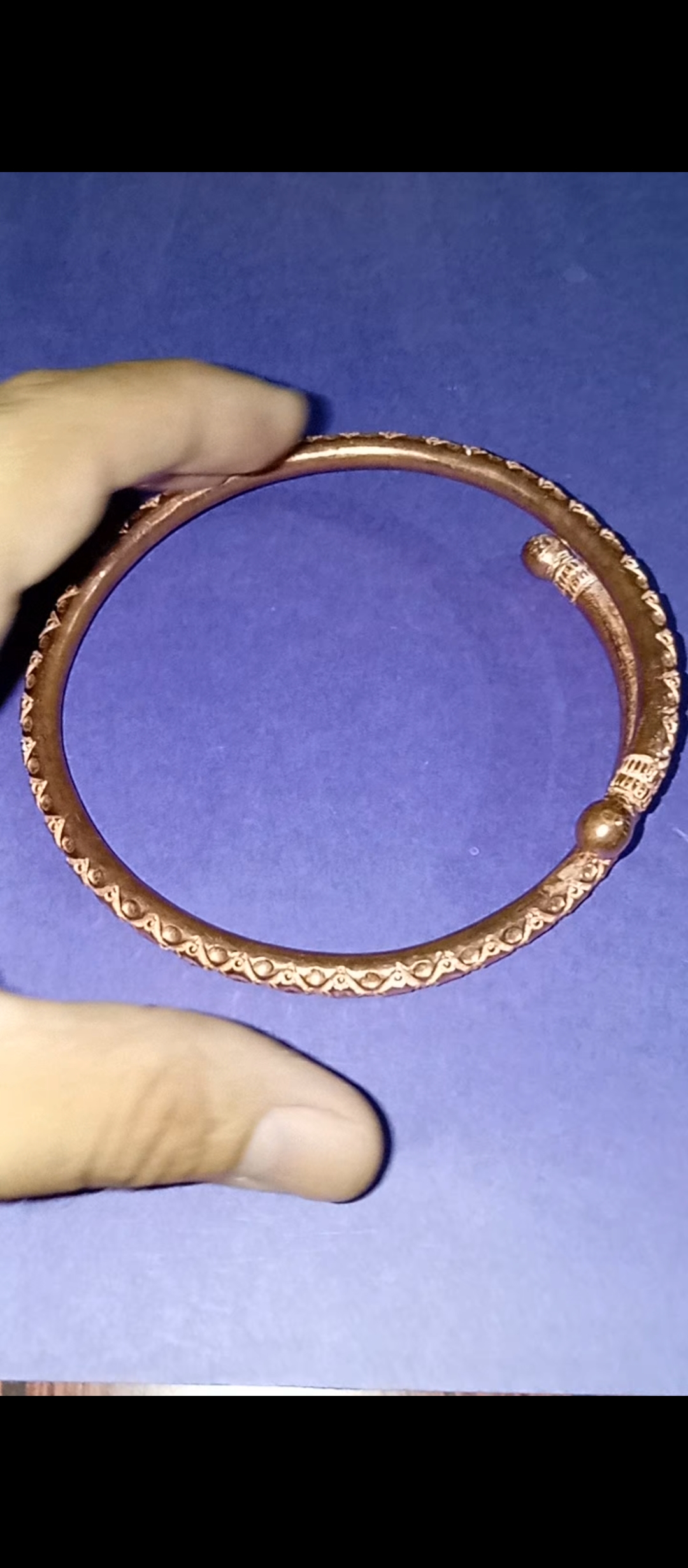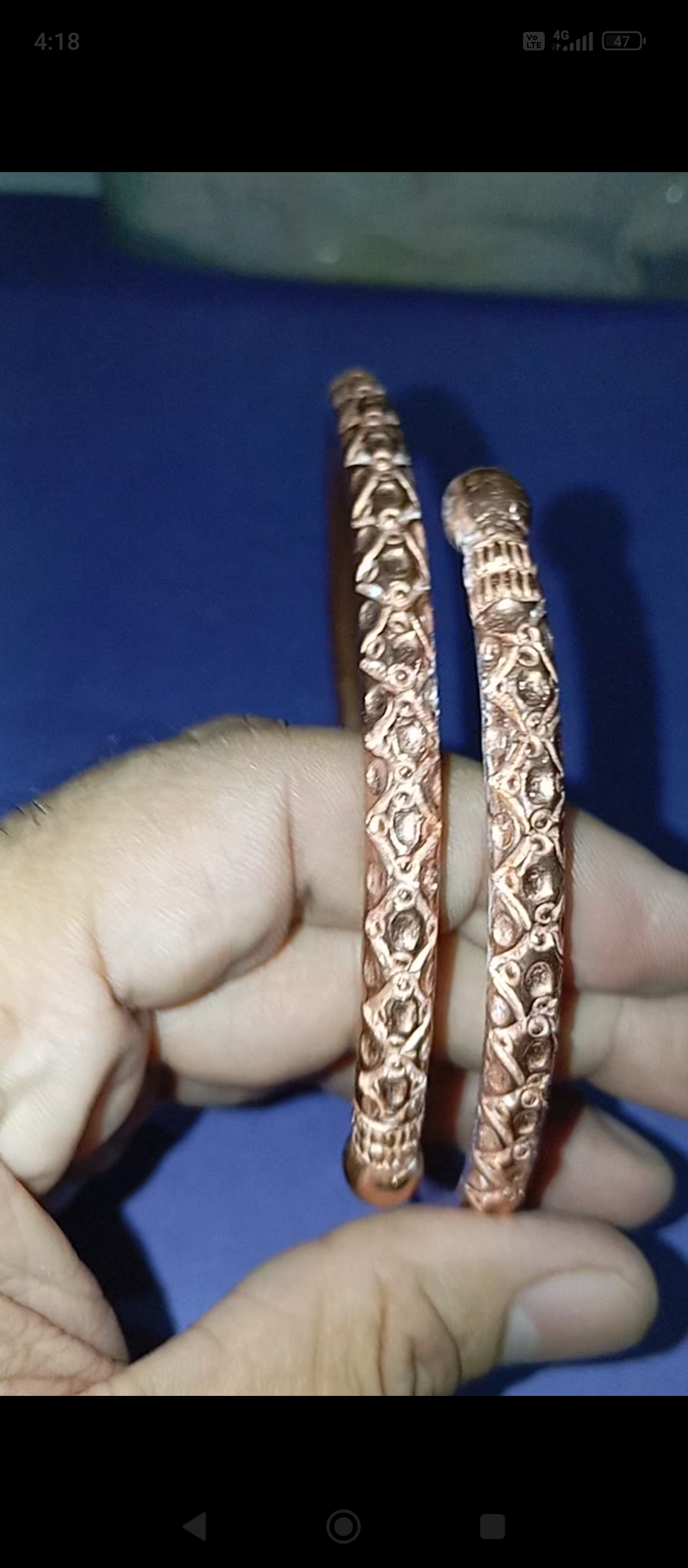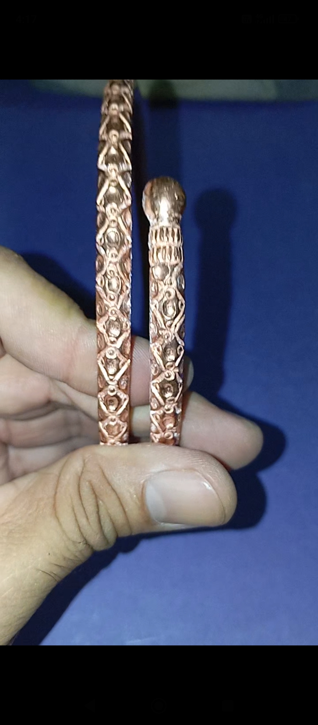 यह शुद्ध तांबे का बना हुआ एक सिंगल मोटे तार का कड़ा है और उसी के अंदर डिजाइनों को एंटीक तरीके से निकाला जाता है यह डिजाइन आप देख रहे हैं जो इस कड़े के दोनों मुंह पर हैं